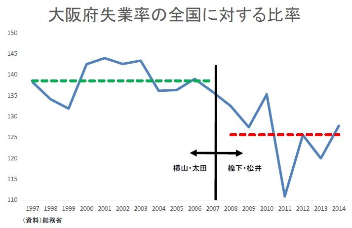 次に、失業率では、横山・太田時代に全国を40%近く上回っていたが、橋下・松井時代は25%程度とまだ全国水準までは達していないが、かなり改善傾向を読み取れる。