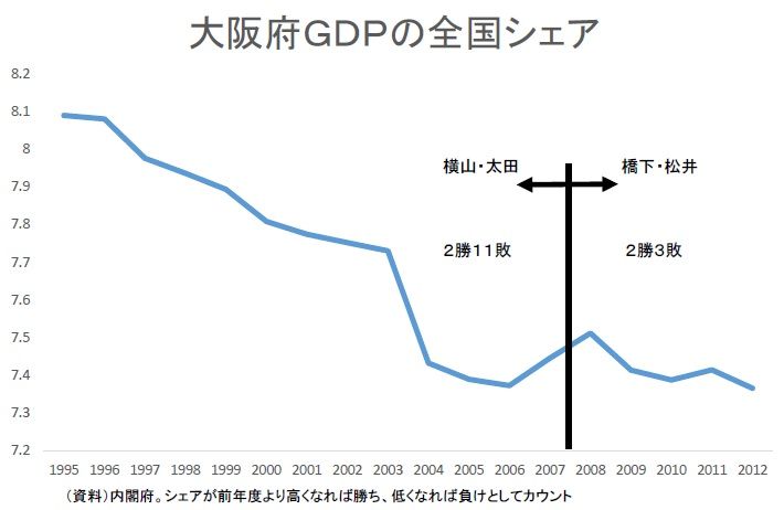 大阪の経済活動が本格的に回復するにはまだ時間がかかるだろうが、横山・太田時代と橋下・松井時代を比較する限り、橋下・松井時代に分があるようだ。ダブル選挙における、大阪府市民の判断が見ものだ。